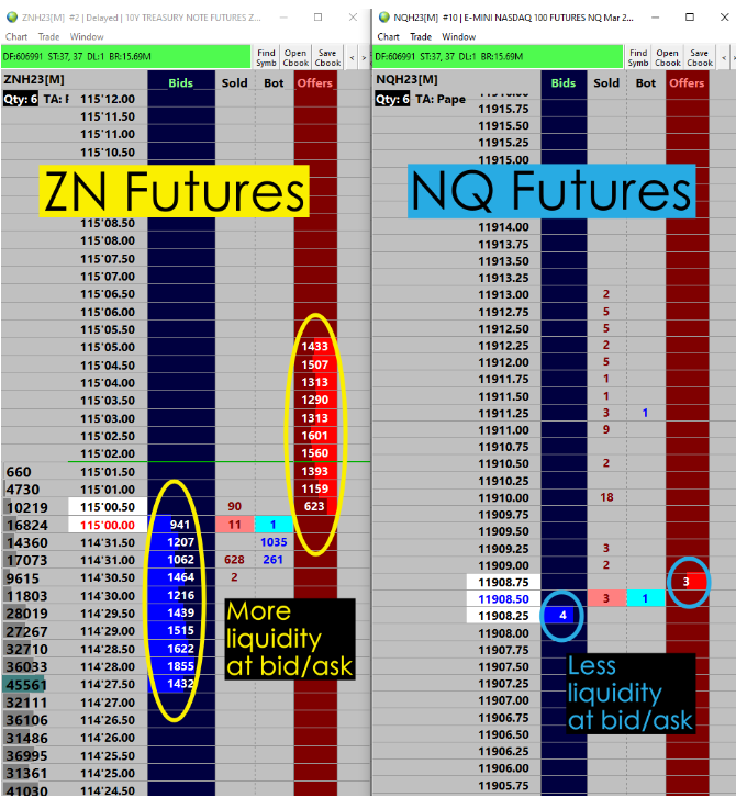 As a result, it is much easier to get your bond trades filled during active trading hours (most of the time) at your desired price compared to products with less liquidity such as the NASDAQ futures (NQ).